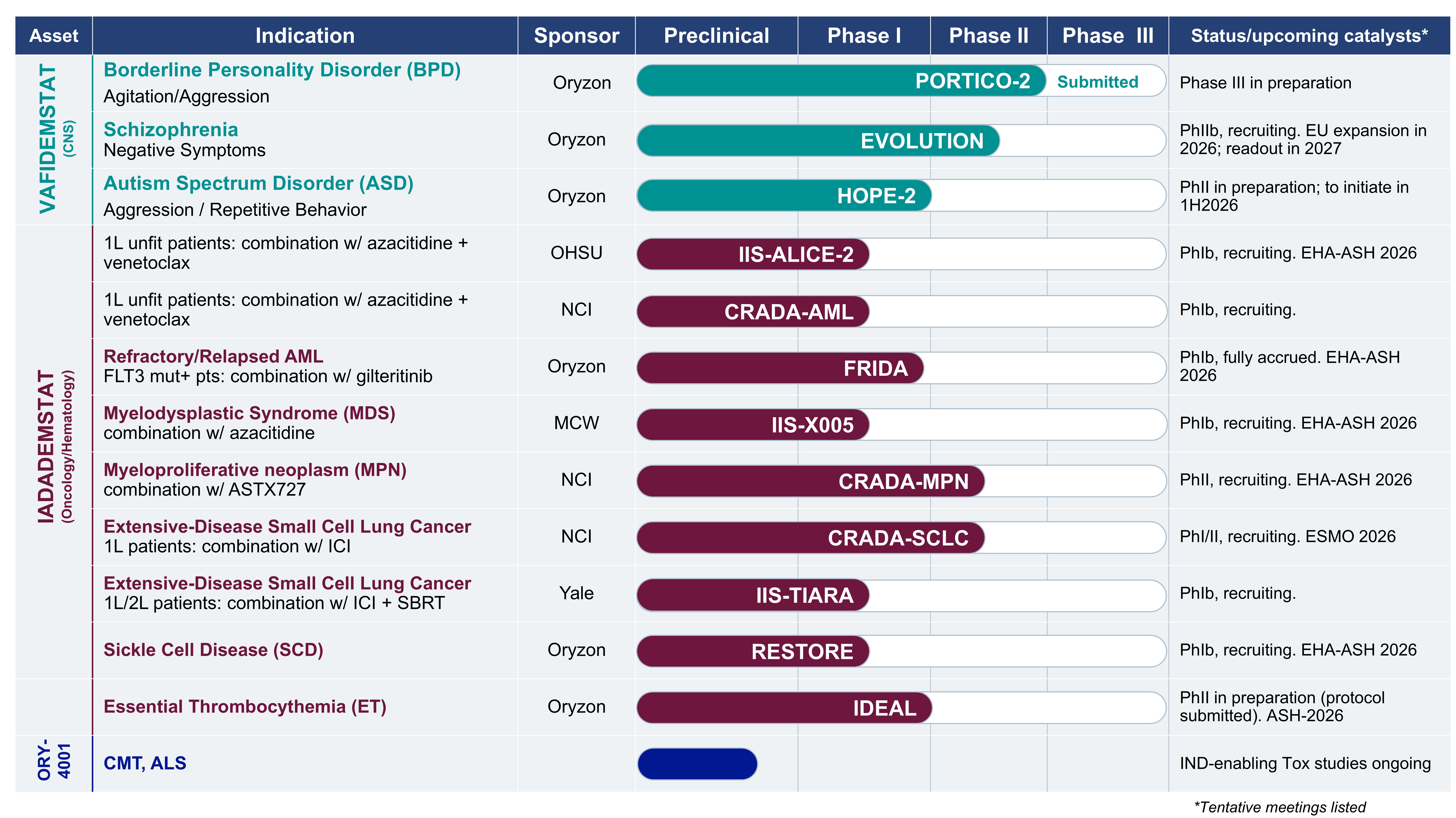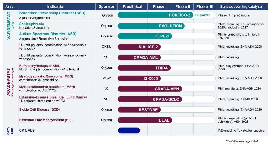As reflected in the chart below, Oryzon has two drugs in clinical development in multiple therapeutic indications: iadademstat, a selective LSD1 inhibitor for oncology/hematology, and vafidemstat, a CNS optimized LSD1 inhibitor for CNS and psychiatric disorders. Our pipeline also includes ORY-4001, a selective HDAC6 inhibitor, and additional programs at earlier stages of development.