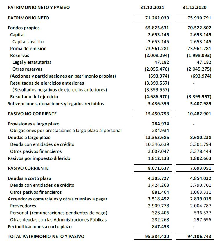 El balance a 31 de diciembre de 2021 presenta un patrimonio neto de 71,2 M€.